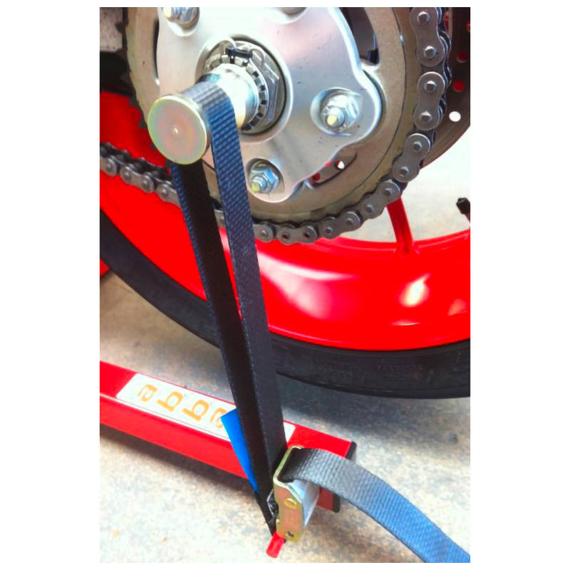Das Hebeband kann entweder direkt um die Schwinge des Motorrades oder falls vorhanden um die Ständeraufnahmen mit den abba Ständeradaptern montiert werden.