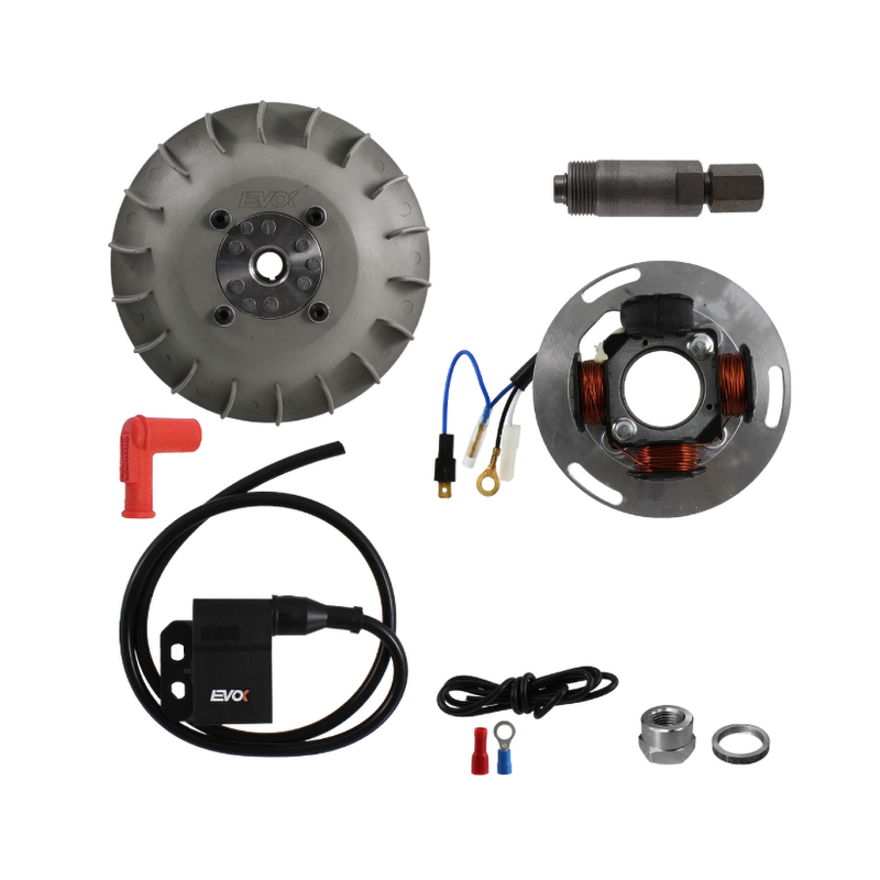 Diese Zündung ist Pickup gesteuert und verfügt über eine variable Zündzeitpunktverstellung. Die deutlich gesteigerte Lichtleistung im Vergleich zu einer alten Zündanlage ist schon bei niedrigen Drehzahlen sichtbar, ebenso ein sauberer Motorrundlauf. Das leichte, gewuchtete Polrad sorgt neben der optimierten Kühlung auch für einen starken Durchzug aus dem unteren Drehzahlbereich. Über den mitgelieferten Spannungsregler wird das Bordnetz stabil mit 12V Gleichstrom versorgt und die Batterie kontrolliert geladen. Ob warm oder kalt, die moderne CDI Steuerung lässt den Motor in jedem Betriebszustand zuverlässig anspringen.