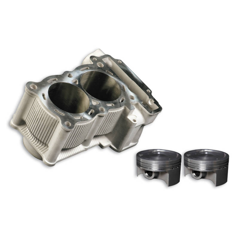Bohrung: 70 mm x2, Hub: 73 mm, Hubraum: 560 ccm, Verdichtungsverhältnis: 1:12. Max PS @ 7.800 U/min. Zweizylinder aus einem Block: spezielle. Al-Si-Cu Legierung, gehärtet und spannungsfrei, Zylinderlaufbahnen: Nicasil-beschichtet und ultrapräzise gefertigt in unseren hochmodernen Fertigungsbereichen, Im Kreuzschliff gehont bei 110/130°, Geschmiedete Kolben: spezielle Al-Si-Cu Legierung, gehärtet, speziell geformter Kolbenkopf mit Ventilaussparungen, Renndesign, verstärkt und gewichtsoptimiert bei gleichbleibender Wandstärke, Kolbenringe (3): 1. Ring – Verdichtungsring/2. Ring – Zwischenring: phosphatbeschichteter Stahl, 3. Ring – Ölabstreifring: 3-teiliger Ölring (chrombeschichtete Ringflanken aus Stahl, inklusive Federring)