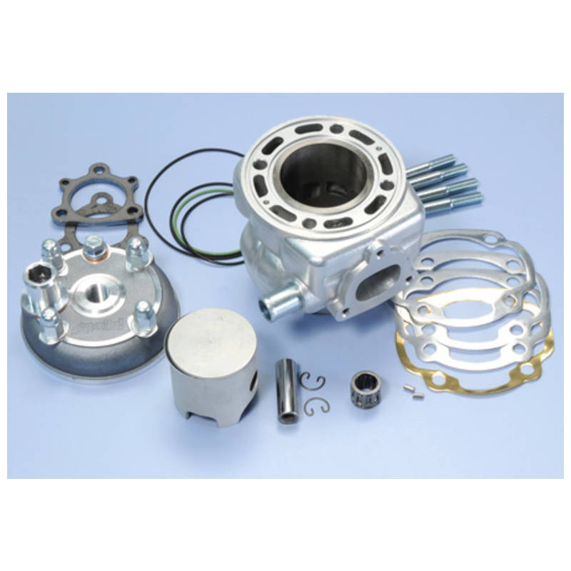 Nur ein Jahr nachdem Polini den Evo3 vorgestellt hat, wirft man bereits eine neue Version auf den Markt. Die Grunddaten sind gleich geblieben: beschichteter Alu-Zylinder mit T-Port-Auslass und 6 Überströmkanälen. Man beruft sich auch hier auf erprobte Designs. In der Außenform geht man hingegen komplett neue Wege: runde Form mit seitlichen Kühltaschen. Der Kopf ist kostensparend, aber bewährt aus einem Stück gefertigt. Auch am Auslass hat man sich umorientiert und setzt auf einen stabileren 3-Loch-Flansch; somit ist man zumindest in der Auswahl der Auspuffanlagen eingeschränkt. Die Bohrung bleibt regelkonform für die meisten Rennstrecken auf 47,6 mm begrenzt, um die 70-ccm-Grenze nicht zu überschreiten. Leistungsniveau je nach Vergaser und weiteren Komponenten zwischen 20-23 PS. Achtung, es wird eine Welle mit 85-mm-Pleuel benötigt.