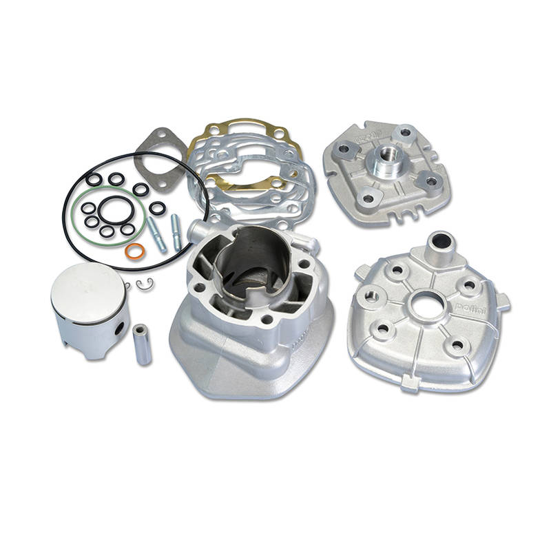 Zylinder Polini Evolution III 70cc. Der neue Polini Evolution ist nun in der dritten Auflage erhältlich. Größere Veränderungen haben nicht stattgefunden, jedoch wurde der Auslass komplett überarbeitet und ist nun mit einem geteilten T-Port statt wie beim Evo2 mit Hauptauslass und zwei seitlichen Nebenauslässen versehen. Der Brennraum ist weitestgehend gleich geblieben. Dafür erweist sich die Kalotte als thermisch günstiger gestaltet. Qualitativ ist die Verarbeitung wieder auf einem hohen Niveau. Lieferung erfolgt komplett mit allen zur Montage benötigten Teilen.
